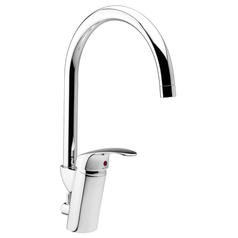 Praktisk høy kjøkkenkran med avstengning for oppvaskmaskin. Med eco-save for ekstra vannsparing og skoldesperre for ekstra trygghet.