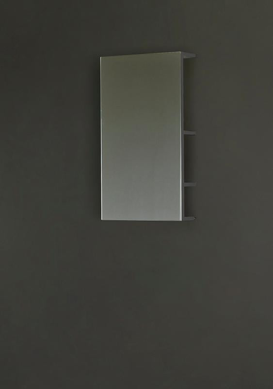 Oppbevaringsspeil med hyller som er tilgjengelig fra begge sider. Lett tilgjengelig 230 V-uttak, og med plass til f.eks eltannbørsten. Ferdigmontert.