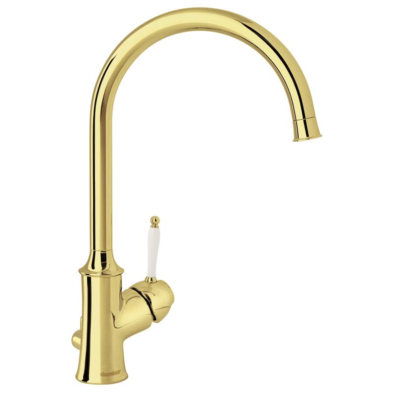 Nostalgisk kjøkkenkran med avstengning for oppvaskmaskin diskret plassert på baksiden. Ettgreps kran med eco-save og skoldesperre. PVD-behandlet overflate i messing.