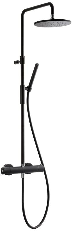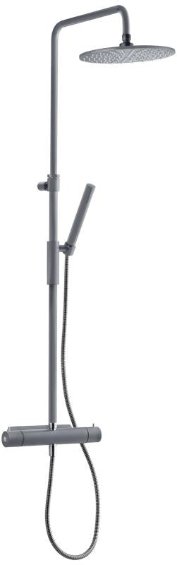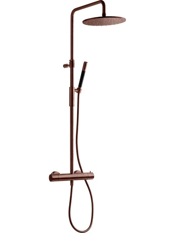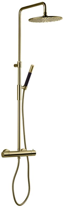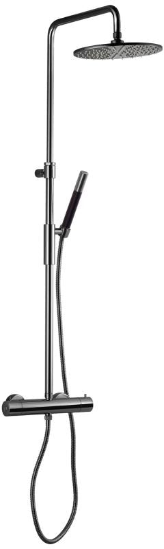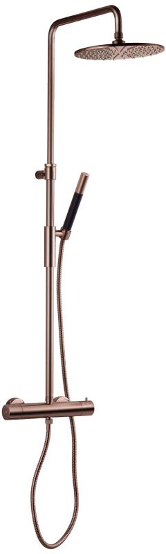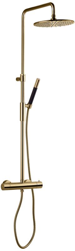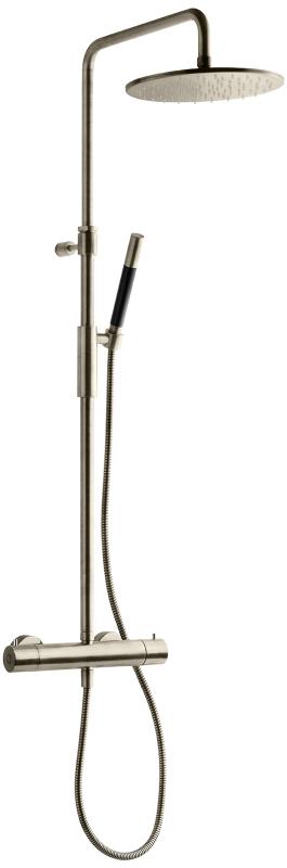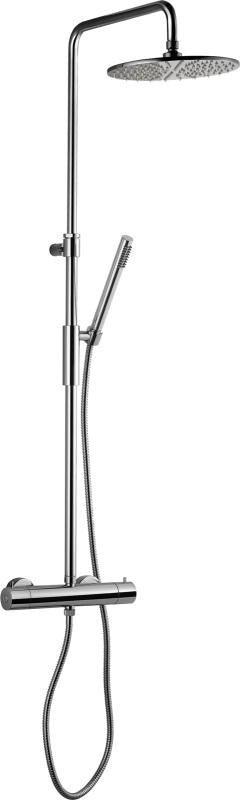 Takdusj med trykk- og termostatstyrt dusjbatteri. Teleskopstang for enkel høydetilpasning av taksilen.