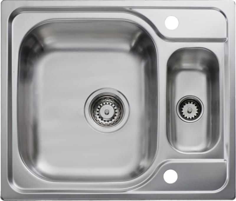 Vendbar vask med stor og liten kum for nedfelling. Leveres med kurvventiler, overløp, to kranhull, dekkskive og vannlås.
