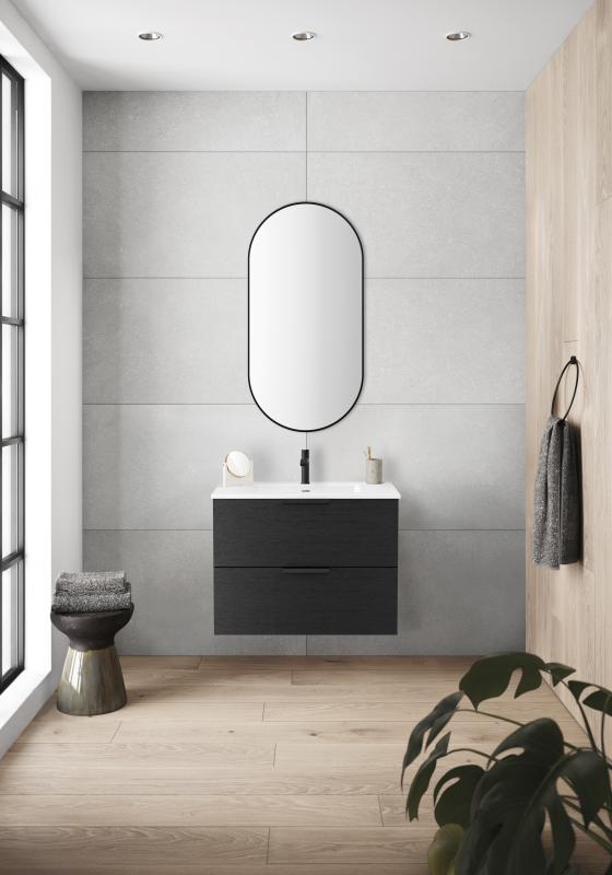 Variant40 servantskap med porselensservant og Milano speil med lys og sort ramme. Tilgjengelig i flere utførelser.