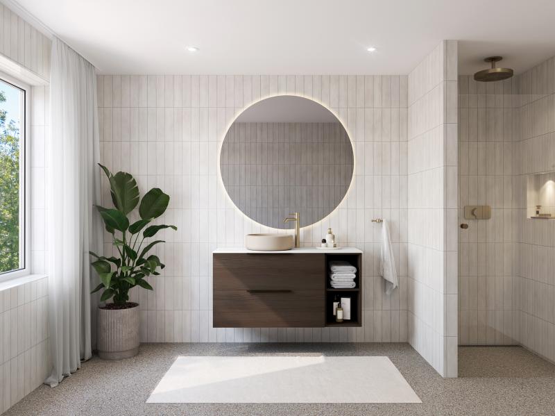 Lekkert baderomsmøbel med åpen hylle i Mørk ask. Pris inkludert alle moduler i miljøet: 1 x Variant46 Mørk ask servantskap 90 cm med to skuffer, profilhåndtak antikk bronse, åpen hylle 30 cm, Dekton benkeplate Neural 121 cm og Space cream mineralservant. Dekorativt rundt Moon speil med lys og varmefelt for antidugg ø120 cm. Tilgjengelig i flere utførelser.