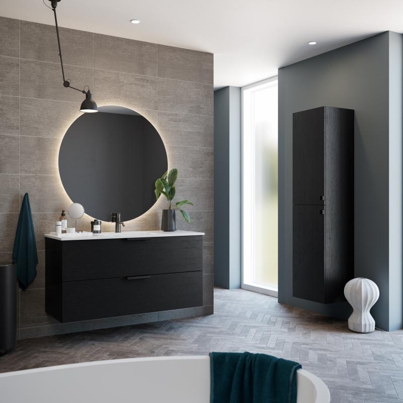 Servantskap Sort eik med porselensservant, profilhåndtak børstet sort. Moon speil med lys og varmefelt for antidugg ø100 cm. Totalpris eks. høyskap som kan kjøpes separat.