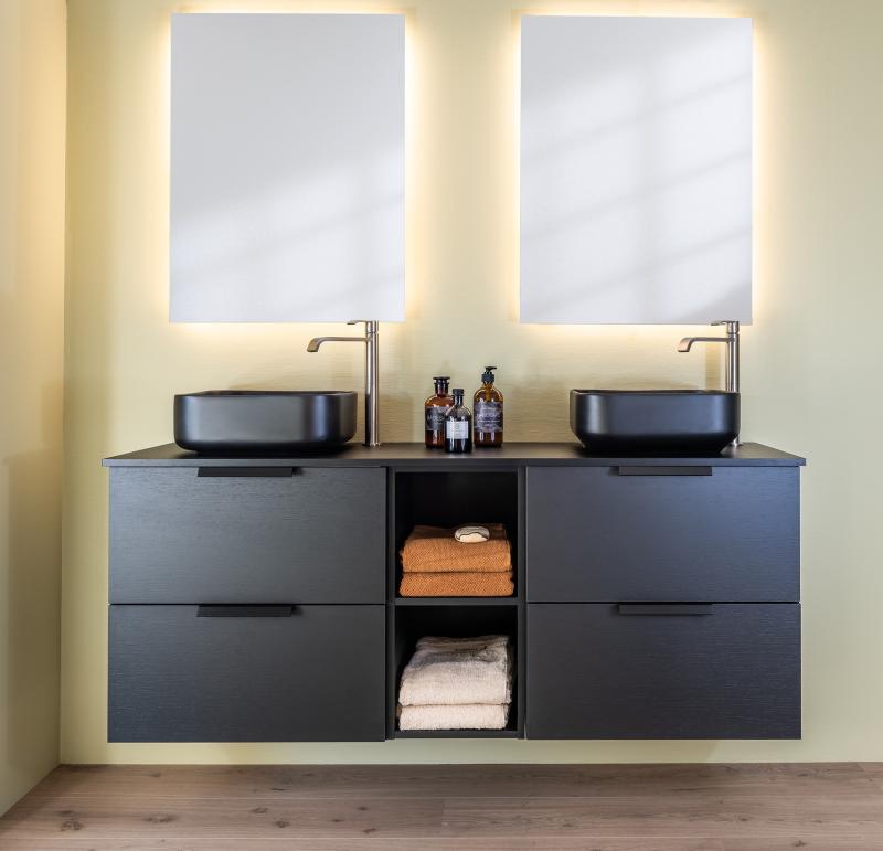 Pris inkludert alle moduler i miljøet; 2 x Variant46 servantskap B60 D46, profilhåndtak børstet sort og åpen hylle B30. Benkeplate B151 D46,5. 2 x Monaco porselensservant. 2 x Frame speil med lys og varmefelt for antidugg B60 H80.