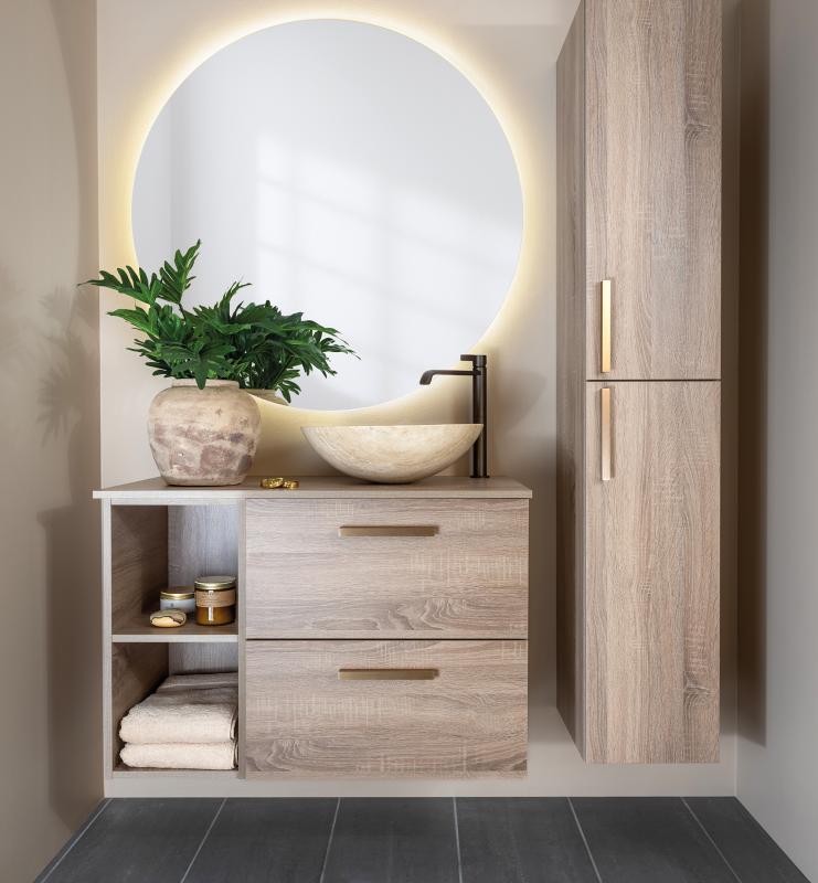 Pris inkludert alle moduler i miljøet; Variant46 servantskap med to myktlykkende skuffer og glass i sidene B60 D46. Åpen hylle B30. Benkeplate B91 D46,5. Roma travertinservant. Moon speil med lys og varmefelt for antidugg ø100 cm. Høyskap med to dører B30 D35. Totalbredde miljø inkl. høyskap 120 cm.