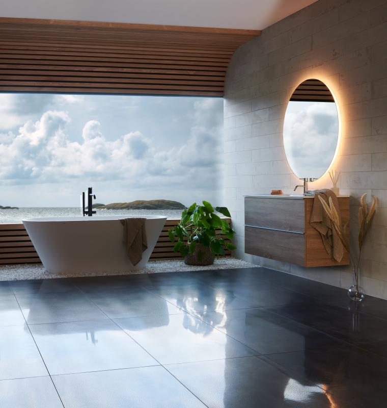 Baderomsmøbel med to skuffer med glass i sidene. Møbelpakken inneholder Variant48 120 servantskap i Eik struktur med heldekkende Air porselensservant, alu grepslist. Rundt Moon speil med lys og varmefelt for antidugg. Stemingslys på faststrøm.