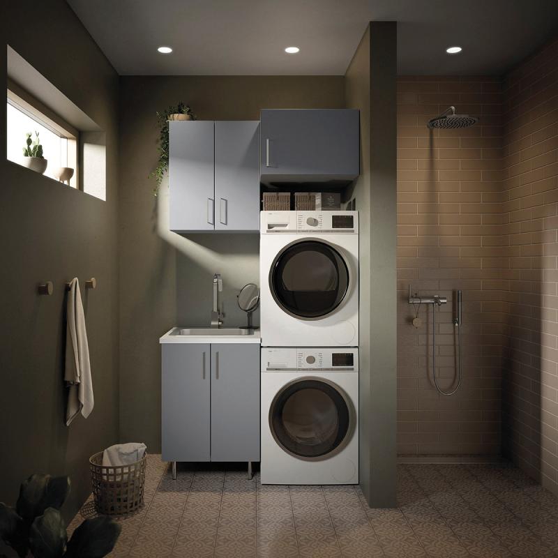 Vaskeromsinnredning med underskap B60 for vaskekum med hvit benkeplate. Støtteben. Overskap B60. Overskap vaskesøyle B60. Tilgjengelig i Hvit, Grå og Sort matt.