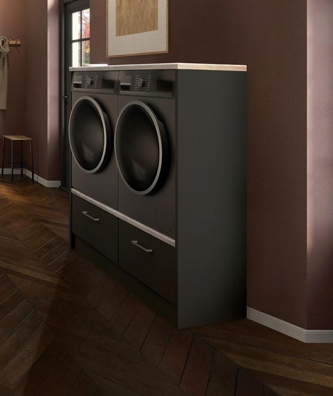 Vaskeromsinnredning med underskap B60 for vaskemaskin.Underskap B60 for tørketrommel. Lys eik benkeplate 120 cm. Dekksider. Lys eik benkeplate 123 cm. Totalbredde miljø inkl. dekksider 123 cm.