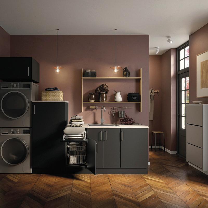 Overskap B60. Skittentøyskap B60 med trådkurver og Lys eik benkeplate. Underskap B40 med trådkurver og strykebrett. Underskap B60 for vaskekum. Underskap B50. Lys eik benkeplate. Støtteben/Sokkel. Tilgjengelig i Hvit, Grå og Sort matt.