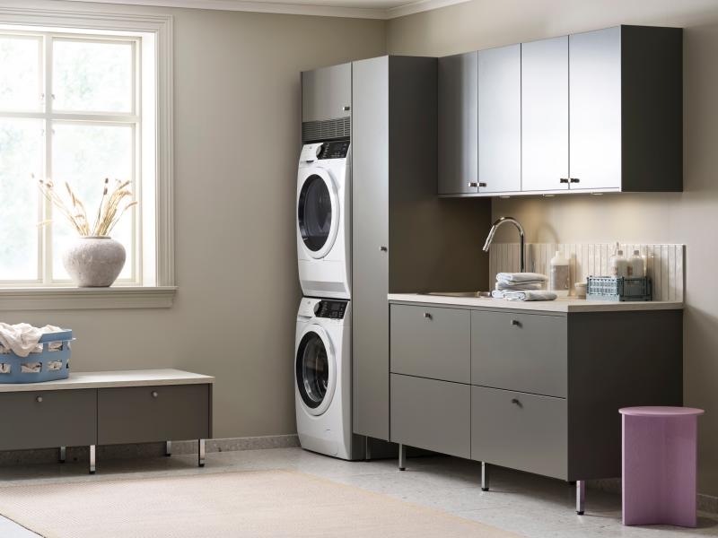 Vaskesøyle med toppskap, høyskap m dør og fem hyller, oppvaskbenkskap, underskap med skuffer, dekorsider, belysningsbunn med spotter, støttebein, benkeplate Ipanema hvit, overskap, knotter, vaskekum