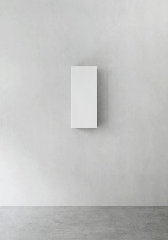 Grunt veggskap med to glasshyller og en myktlukkende dør som kan monteres til høyre eller venstre. Kan plasseres høyt eller lavt, f.eks. over toalettet, som ofte er en uutnyttet plass.