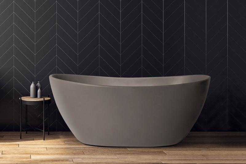"Viena "Betong look" er et lekkert frittstående badekar. Det ovale designet skaper et mykt og moderne uttrykk. «Betonglooken» gjør dette badekaret til rommets absolutte midtpunkt. Leveres i grå matt kompositt, med klikkventil og justerbare ben. Hvert produkt er unikt da det håndlages/pusses for hånd. Variasjoner vil forekomme på modeller i farget utførelse (svart og grå) hvor pigment er tilsatt steinblandingen. Badedybde 45cm. Vekt 140 kg""