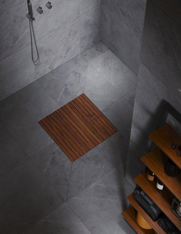 Vieser Square rist med oljebehandlet Kebony. Vieser Square design gulvsluksystem består av tre deler: Ramme, rist og Vieser-sluk valgt i henhold til bygningsgrunnlaget.