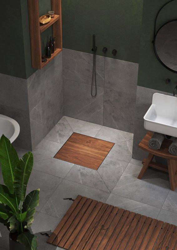 Vieser Square rist med oljebehandlet Kebony. Vieser Square design gulvsluksystem består av tre deler: Ramme, rist og Vieser-sluk valgt i henhold til bygningsgrunnlaget.