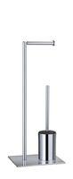 Frittstående toalettrull- / reserverullholder og toalettbørste i ett. Toalettrullholderen vippes opp og reserverullene tres på. Plass til 4 ekstra ruller. Produsert med firkantet fot. Farge: Krom. Høyde 62cm Toalettbørsten har sort børsthode med nylonbust. Ekstra børstehode kan kjøpes separat.