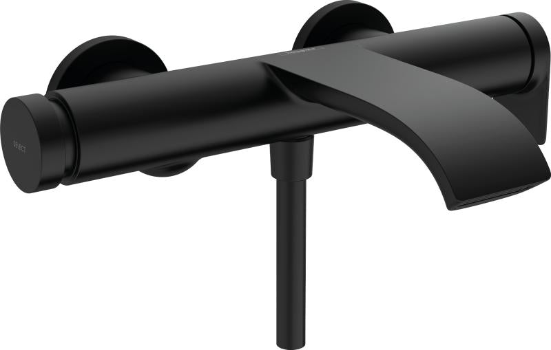 Matt sort badekararmatur med organisk design og vannfallstråle. Velg mellom kartut og hånddusj med Select trykknapp. Fås også i krom og matt hvit.