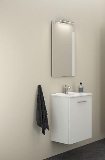 1904 Voss møbelpakke, 50x35 cm hvit matt med 1 dør, servant og 50 cm speil. Her kan velges høyre (7041014) eller venstre (7041015) hengslet servantskap. Belysning og armatur kommer som tillegg i prisen. Voss fra 1904 har rene linjer og passer inn i alle baderom, uansett størrelse og stilretning. Med 1904 Voss får du nordisk design i god kvalitet med lang levetid. 1904 Voss er produsert utfra målet å redusere unødvendige belastninger på miljø og klima. Møblene er godkjent for svanemerket bygg